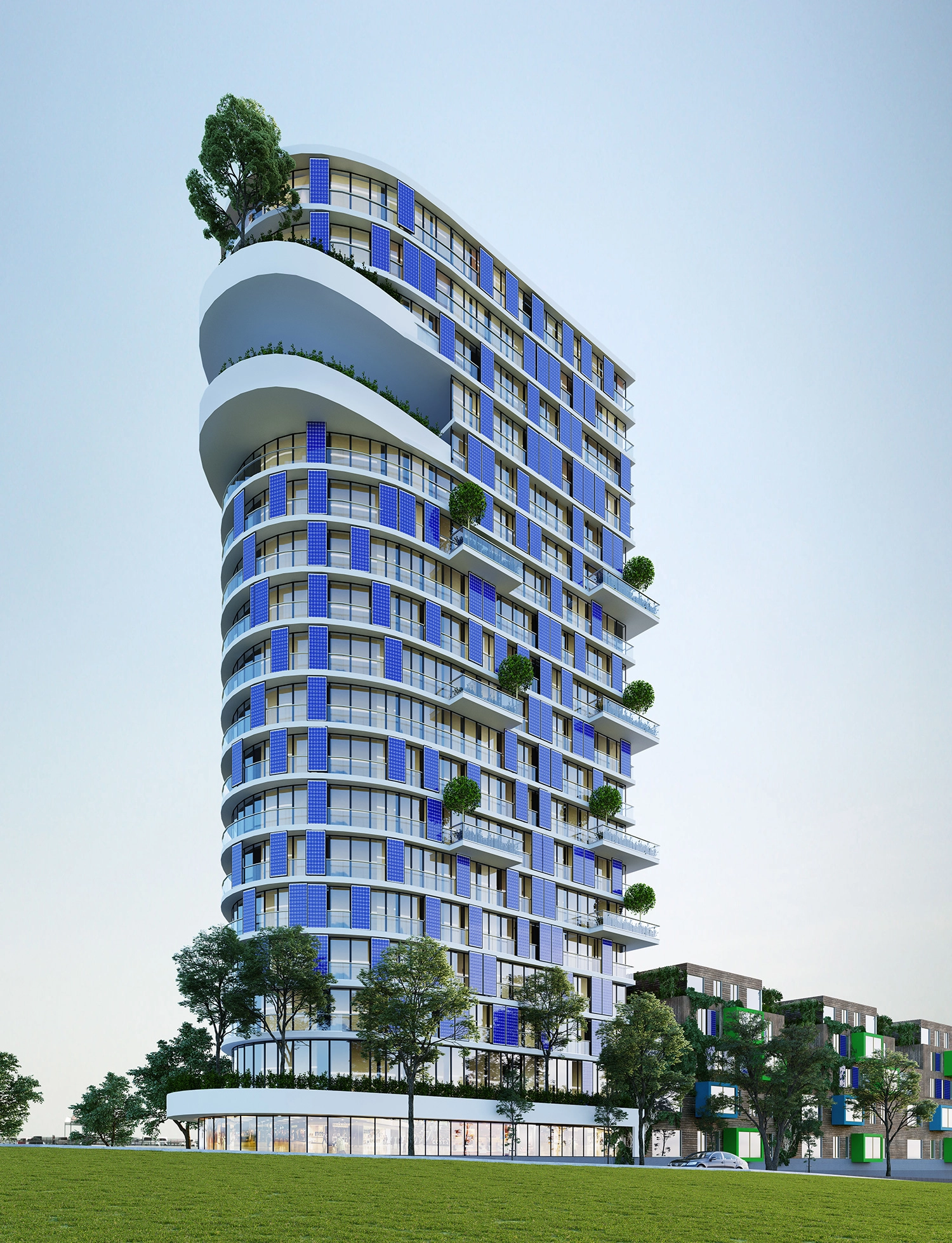 Maximale Nutzung der Sonnenenergie, optimale und natürliche Gebäudeklimatisierung durch Bioklimatisierung mit neuester Fassadentechnik. Sparsamer Umgang mit Grund und Boden. 400-500 Einwohner auf 0,8 Hektar statt wie üblich auf 5-6 Hektar.